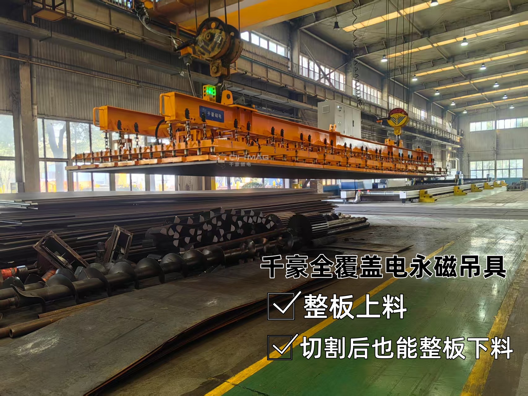 全覆蓋電永磁吊具是一種新型電永磁吊具,通過技術(shù)團(tuán)隊不斷地研究,將磁路設(shè)計成一種全部覆蓋型的電永磁吊具,針對鋼板下料很難將切割后的鋼板一整版原模原樣搬運下激光切割臺,而千豪磁電的這款產(chǎn)品將磁力覆蓋下方每個切割的零件,能保證將切割后的鋼板原模原樣搬運下來。這也是激光切割界的重大助力神器!